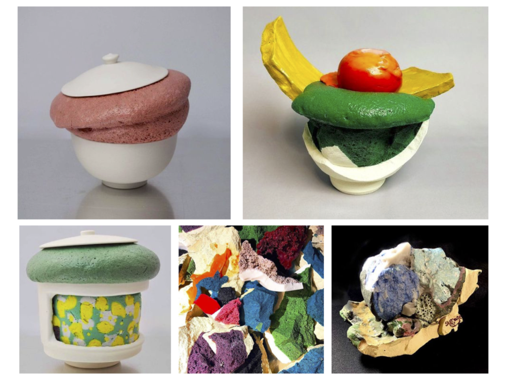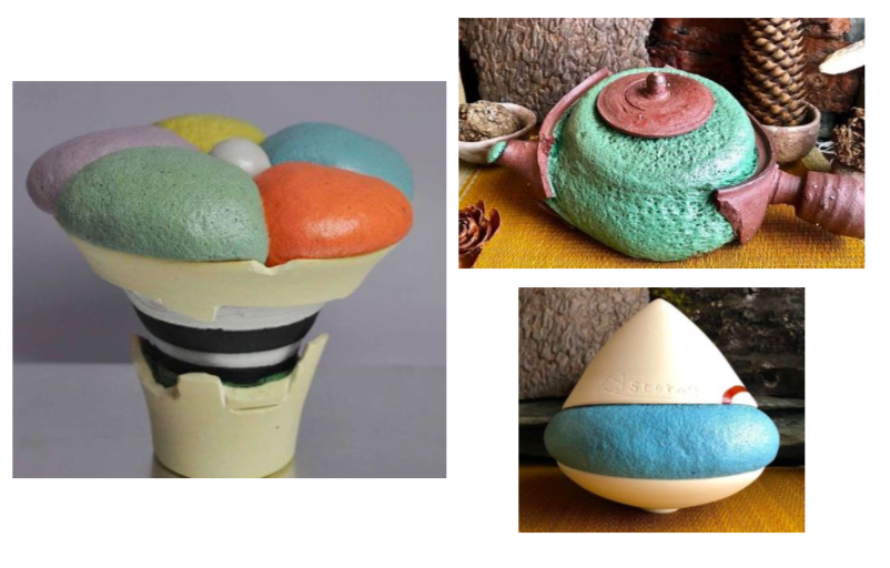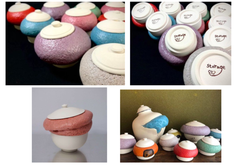 この場合の器は食べ物を乗せるためのものではなく、造形物へと変わるための器です。その器を釉薬や陶器の破片で満たして焼成することで、storageシリーズの作品は生まれます。